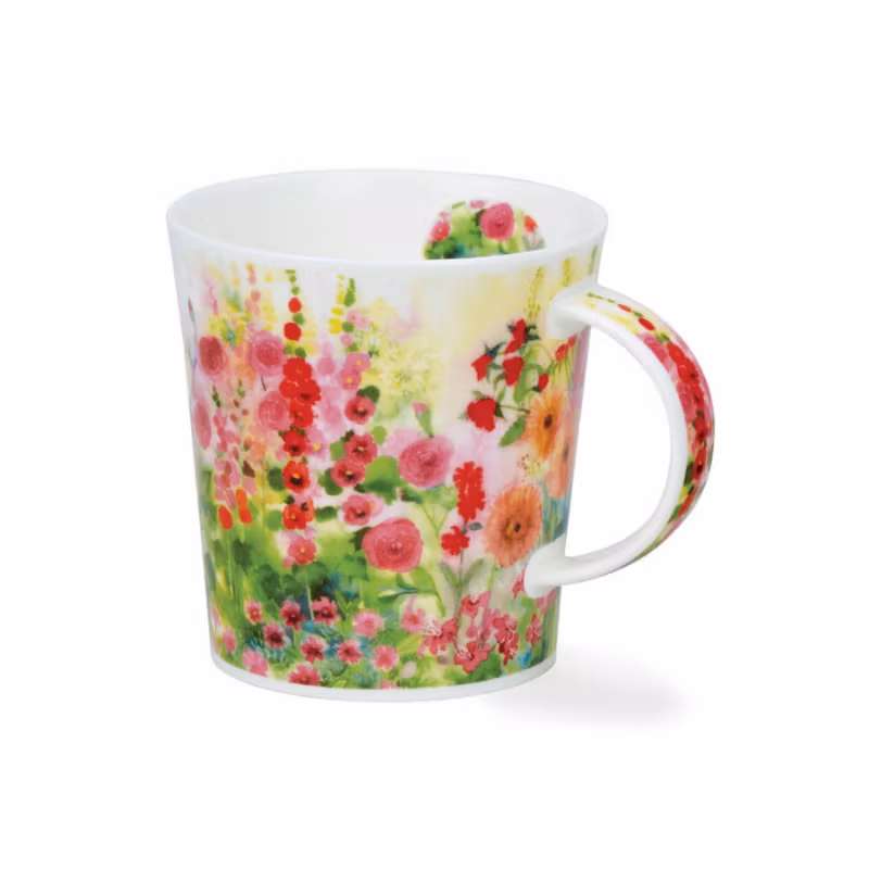 Mugg av mycket hög kvalitet. Materialet är finaste benporslin och den är tillverkad av den välkända Dunoon-fabriken i England. På just denna mugg finns en härlig dekor av bl a Stockrosor, Fingerborgsblomma, Rosor och Dahlior i olika nyanser av rosa, rött och orange. Perfekt present till trädgårdsälskaren. Dekoren går runtom hela muggen. Det finns blomdekor även på insidan av kanten upptill på två ställen i form av en oval fylld med samma slags blomdekor. Även på handtaget är det dekorerat med dessa färggranna blommor. I botten på utsidan av muggen står namnet på muggen och t o m där finns det likadan dekor som på insidan av muggen.