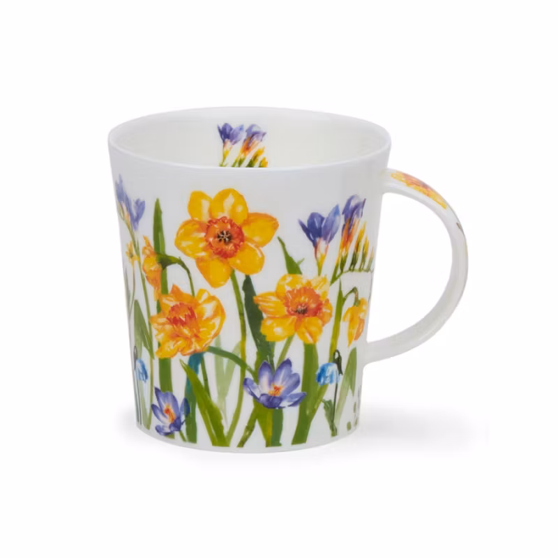 Mugg av mycket hög kvalitet. Materialet är finaste benporslin och den är tillverkad av den välkända Dunoon-fabriken i England. Denna mugg har en härlig blomdekor av Påskliljor och Krokusar. Det är dekor runtom hela muggen och dekor finns även på insidan av kanten upptill på två ställen i form av en stjälk med Krokusar på ena sidan och två Påskliljor på motsatta sidan. Även på handtaget finns samma typ av dekor som på själva muggen. I botten på utsidan av muggen står namnet på muggen och t o m där finns det enklare dekor av två Påskliljor.