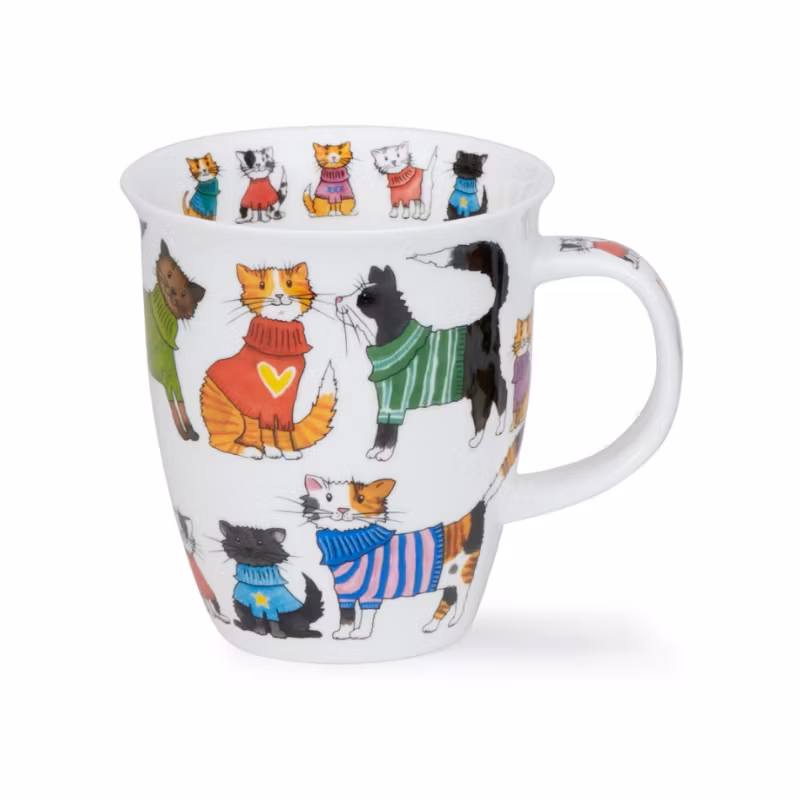 Mugg av mycket hög kvalitet. Materialet är finaste benporslin och den är tillverkad av den välkända Dunoon-fabriken i England. Det är en rolig dekor runtom hela muggen av vuxna katter och kattungar i olika färger iklädda i tröjor även de i olika färger och mönster. Dekor finns även på insidan av kanten upptill på två ställen i form av fem katter iklädda tröjor. Även på handtaget är det dekor i form av fyra av de fem katterna som finns avbildade på insidan av kanten. I botten på utsidan av muggen står namnet på muggen och t o m där finns det enklare dekor av en klassisk gråtabby katt iklädd en orange- och vitrandig tröja.
