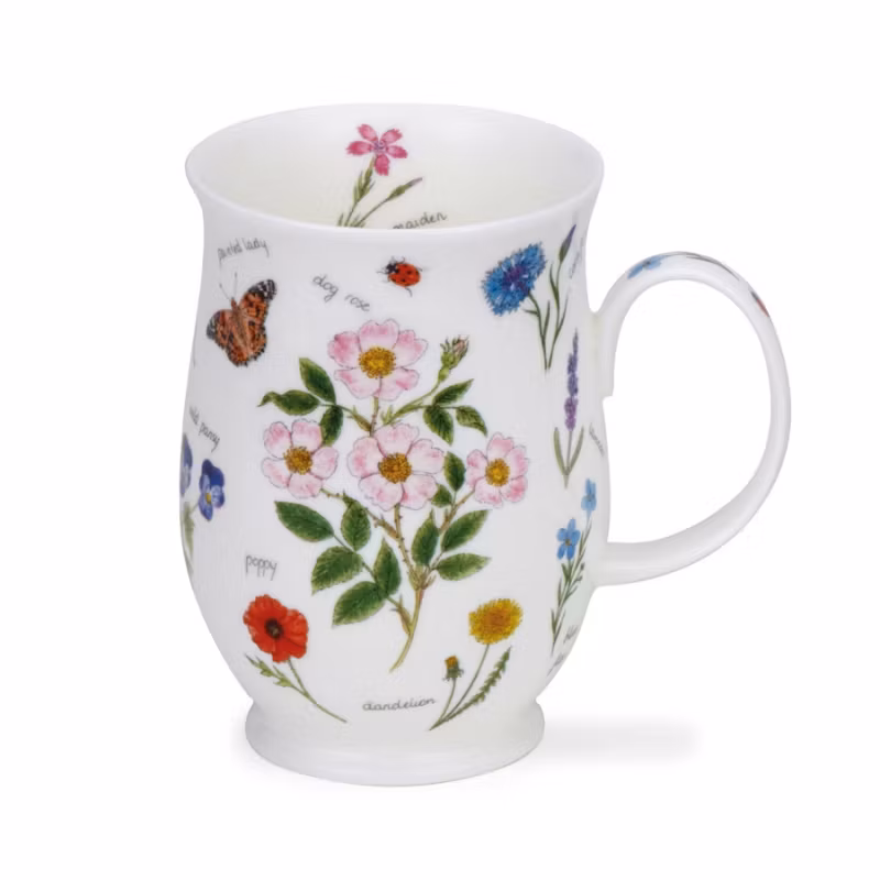Mugg av mycket hög kvalitet. Materialet är finaste benporslin och den är tillverkad av den välkända Dunoon-fabriken i England. Denna mugg har en härlig dekor av blommor med bl a Törnros, Pensé, Smörblomma, Vallmo, Flox, Förgätmigej, Maskros och en del andra blomsorter samt en fjäril och insekter. Perfekt present till den kaffedrickande trädgårdsälskaren. Här kan man dessutom lära sig