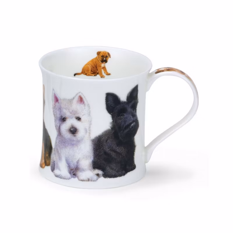 Mugg av mycket hög kvalitet. Materialet är finaste benporslin och den är tillverkad av den välkända Dunoon-fabriken i England. Det är dekor runtom hela muggen med olika bedårande hundvalpar av olika raser. På just denna Puppies C-mugg finner man raserna Skotsk Terrier, West Highland Terrier, Yorkshire Terrier, Jack Russell och Airdale Terrier. På insidan av kanten upptill är det dekor på två ställen i form av en Staffordshire Bullterrier på ena sidan och en Foxterrier på motsatta sidan. Även på handtaget är det dekor. I botten på utsidan av muggen står namnet på muggen och t o m där finns det enklare dekor i form av en West Highland Terriervalp samt namnen på alla hundraser som återfinns på muggen.