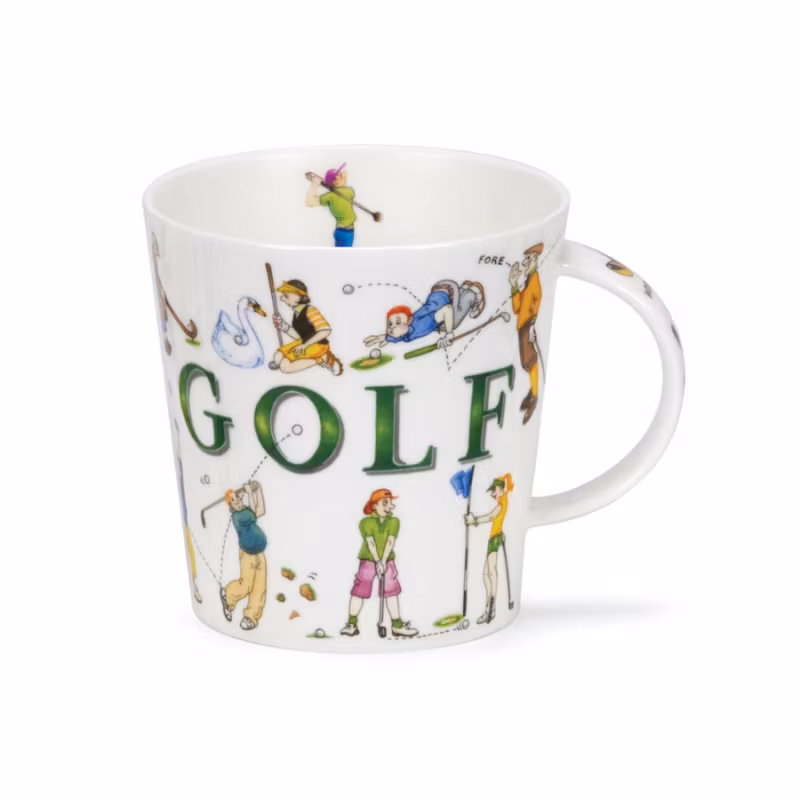 Mugg av mycket hög kvalitet. Materialet är finaste benporslin och den är tillverkad av den välkända Dunoon-fabriken i England. Detta är den perfekta presenten för golfspelaren och -entusiasten. På denna mugg finns en härligt rolig dekor av texten "Golf" omgivet av unga och gamla golfspelare i diverse humoristiska situationer. Dekoren går runtom hela muggen. Det finns även dekor på insidan av kanten upptill på två ställen i form av två olika golfspelare. Även på handtaget är det dekorerat med fyra olika typer av golfklubbor. I botten på utsidan av muggen står namnet på muggen och t o m där finns det enklare dekor i form av en golfboll som kommer flygande i luften på väg mot golfhålet i vilket det står en greenflagga.